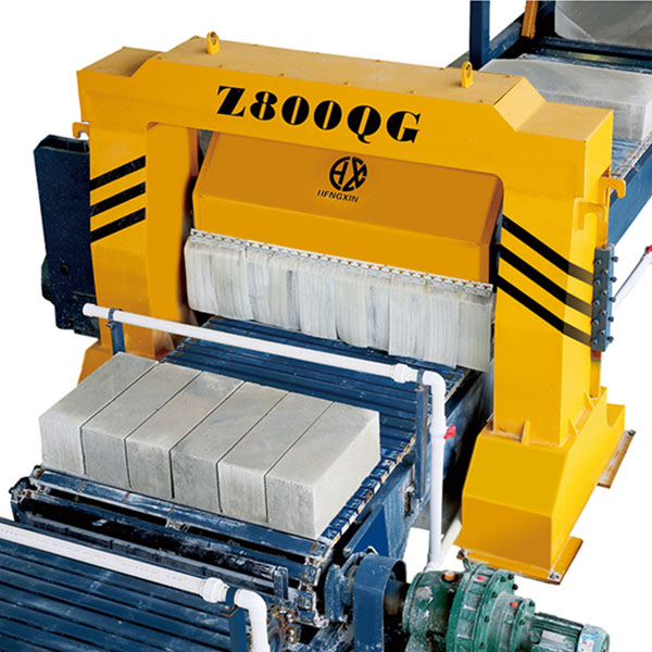 首先是通過Z1600QZ流水線切割機,進行第一次成品切割,Z1600QZ流水線切割機是采用金剛石刀頭,德國進口鋼片制成的刀片精致而成經久耐用。進行完第一次流水線切割后,通過90翻轉機對坯體進行水平方向90度旋轉,改變切割方向。再通過扳倒機對改變過方向的坯體進行翻倒,然后輸送給Z800QG切割機,進行第二次成品切割。
